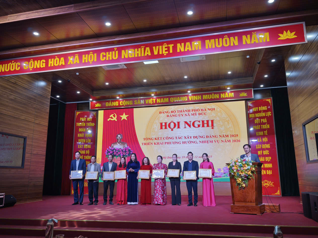 22/12/2025 A- A A+ | BAN CHẤP HÀNH ĐẢNG BỘ XÃ MỸ ĐỨC TẶNG GIẤY KHEN CHI BỘ TRƯỜNG MẦM NON HỢP THANH Xem Chia s? BAN CHẤP HÀNH ĐẢNG BỘ XÃ MỸ ĐỨC TẶNG GIẤY KHEN CHI BỘ TRƯỜNG MẦM NON HỢP THANH Trong năm học 2025 – 2026, Chi bộ Trường Mầm non Hợp Thanh đã không ngừng nỗ lực, phát huy tinh thần trách nhiệm, đoàn kết, sáng tạo trong công tác lãnh đạo, chỉ đạo thực hiện tốt nhiệm vụ chuyên môn gắn với công tác xây dựng Đảng, đặc biệt là trong lĩnh vực kiến thức vệ sinh an toàn thực phẩm, giáo dục dinh dưỡng kết hợp vận động nhằm phát triển thể chất cân đối cho trẻ mầm non. Ghi nhận những kết quả đạt được,sáng ngày 19/12/2025, Ban Chấp hành Đảng bộ xã Mỹ Đức đã quyết định trao tặng Giấy khen cho Chi bộ Trường Mầm non Hợp Thanh vì đã có thành tích tiêu biểu, góp phần nâng cao chất lượng chăm sóc, nuôi dưỡng và giáo dục trẻ trong nhà trường. Trong quá trình thực hiện, Chi bộ đã lãnh đạo nhà trường triển khai đồng bộ nhiều giải pháp thiết thực như: tăng cường công tác tuyên truyền, bồi dưỡng kiến thức vệ sinh an toàn thực phẩm cho cán bộ, giáo viên, nhân viên; chú trọng xây dựng thực đơn khoa học, đảm bảo đủ chất, phù hợp với từng độ tuổi; tổ chức các hoạt động giáo dục dinh dưỡng lồng ghép với vận động, giúp trẻ hình thành thói quen ăn uống lành mạnh, phát triển thể chất cân đối, toàn diện. Bên cạnh đó, Chi bộ luôn quan tâm chỉ đạo công tác kiểm tra, giám sát việc thực hiện vệ sinh an toàn thực phẩm trong nhà trường; phát huy vai trò nêu gương của đảng viên; tạo sự thống nhất, đồng thuận trong tập thể cán bộ, giáo viên, nhân viên và nhận được sự tin tưởng, phối hợp chặt chẽ của phụ huynh học sinh. Giấy khen của Ban Chấp hành Đảng bộ xã Mỹ Đức là sự ghi nhận xứng đáng, đồng thời là nguồn động viên to lớn để Chi bộ Trường Mầm non Hợp Thanh tiếp tục phấn đấu, nâng cao chất lượng chăm sóc, nuôi dưỡng và giáo dục trẻ, góp phần thực hiện thắng lợi nhiệm vụ năm học 2025 – 2026 và những năm học tiếp theo. Tập tin đính kèm Tải về