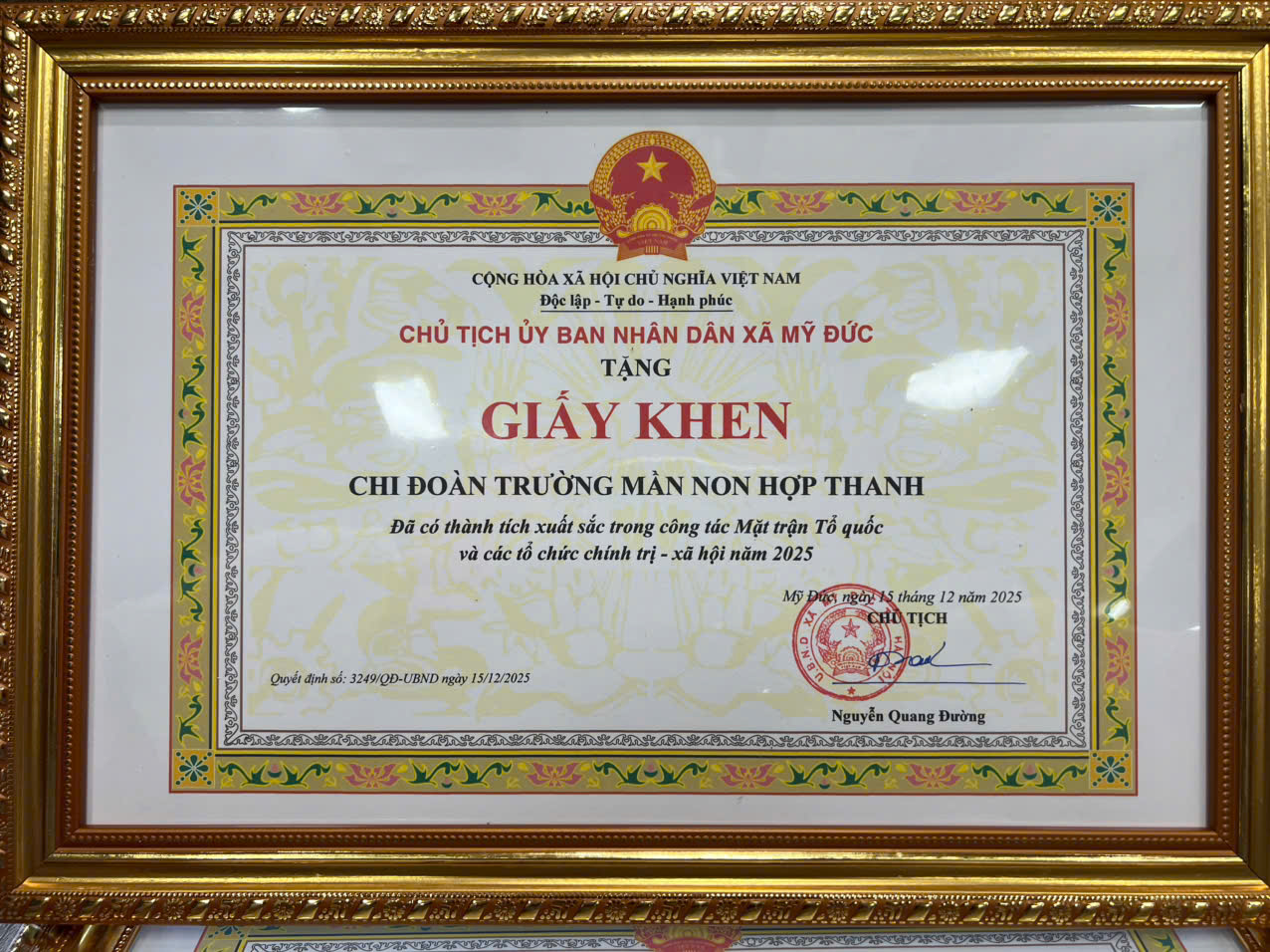 Ghi nhận những nỗ lực và đóng góp tích cực đó, năm 2025, Chi đoàn Trường Mầm non Hợp Thanh vinh dự được Chủ tịch Ủy ban Nhân dân xã Mỹ Đức tặng Giấy khen vì đã có thành tích xuất sắc trong công tác Mặt trận Tổ quốc và các tổ chức chính trị – xã hội. Đây là niềm tự hào, đồng thời là nguồn động viên to lớn để tập thể đoàn viên thanh niên nhà trường tiếp tục phấn đấu, rèn luyện và cống hiến nhiều hơn nữa trong thời gian tới.