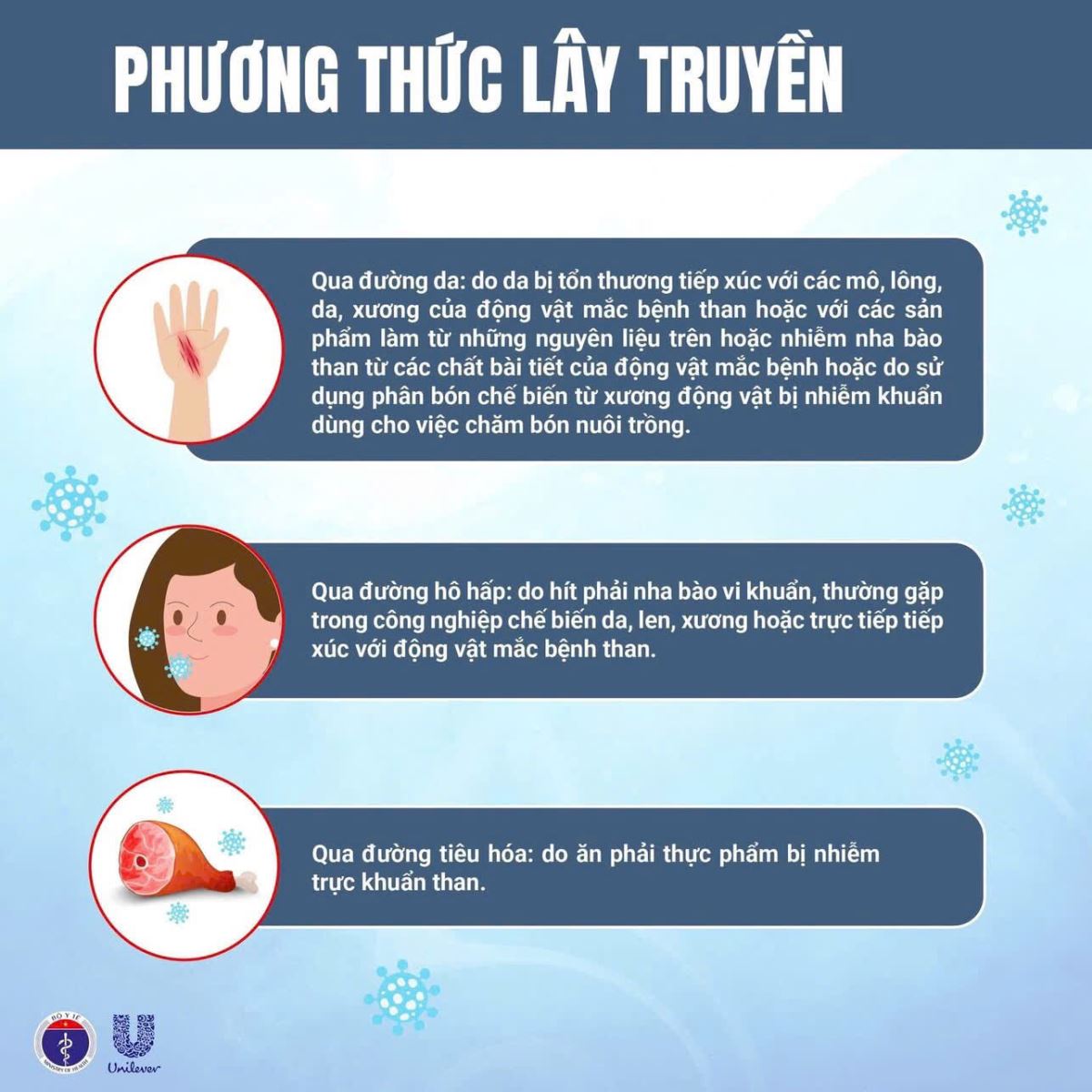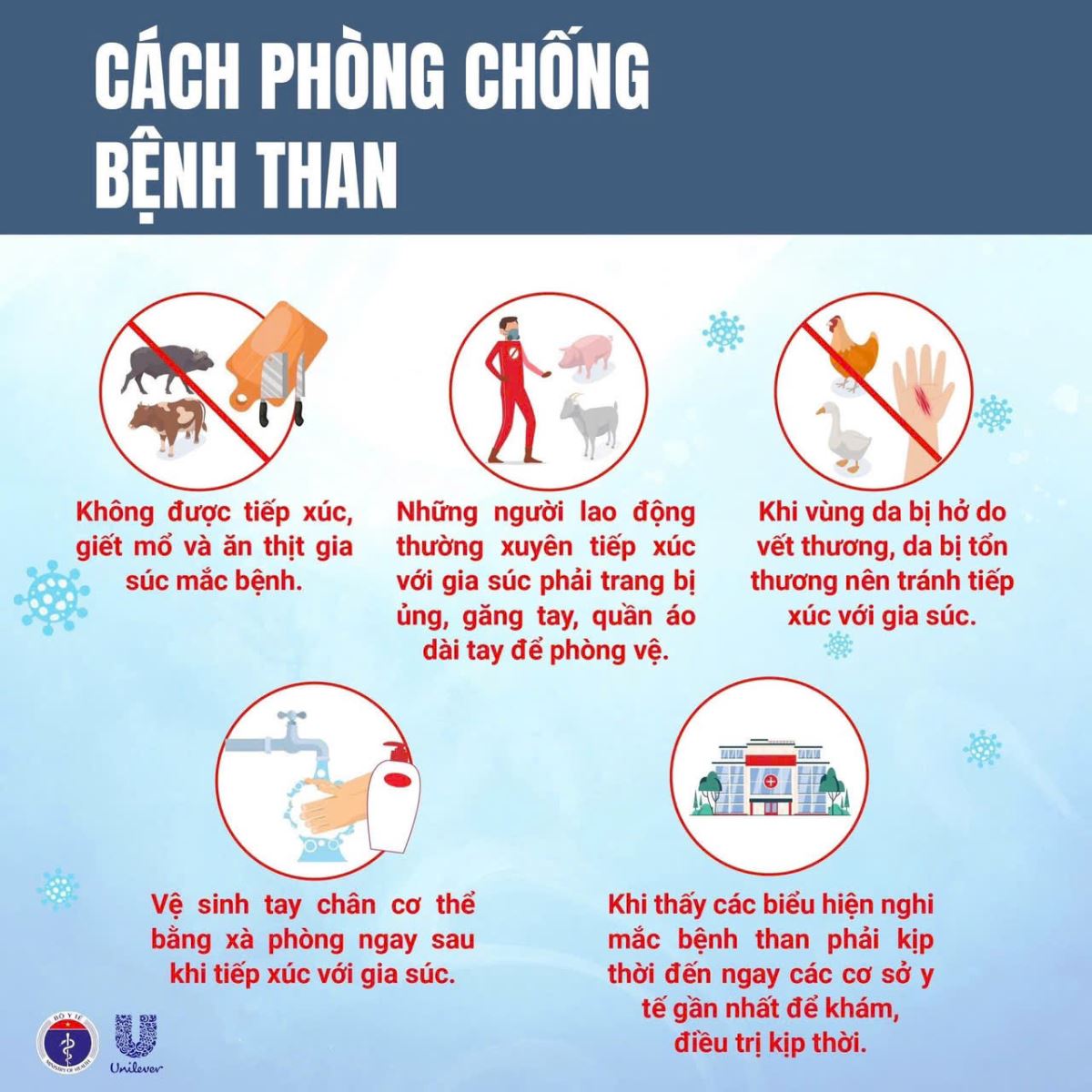 05/12/2025 A- A A+ | PHÒNG, CHỐNG BỆNH THAN NHỮNG ĐIỀU CẦN BIẾT Xem Chia s? ⚠️ PHÒNG, CHỐNG BỆNH THAN NHỮNG ĐIỀU CẦN BIẾT Bệnh than là bệnh nhiễm khuẩn cấp tính, thường gây tổn thương da. Ở thể da, vùng da nhiễm bệnh ban đầu ngứa, sau đó xuất hiện tổn thương, nổi sần, mụn nước và sau 2–4 ngày hình thành nốt loét màu đen. 🦠 NGUỒN TRUYỀN NHIỄM Ổ chứa: động vật ăn cỏ, bao gồm gia súc và động vật hoang dã. Da động vật mắc bệnh, dù đã chế biến, vẫn có thể chứa bào tử than tồn tại nhiều năm. Thời gian ủ bệnh: từ vài giờ đến 7 ngày, đa số trong 48 giờ sau tiếp xúc. Lây từ người sang người rất hiếm. Gia súc mắc bệnh có thể làm nhiễm đất, nước, thực vật và lây sang người. 🔥 PHƯƠNG THỨC LÂY TRUYỀN ✔️ Qua đường da Da bị tổn thương tiếp xúc với mô, lông, da, xương của động vật mắc bệnh; hoặc với sản phẩm chế biến từ động vật nhiễm khuẩn; hoặc nhiễm bào tử từ chất bài tiết của động vật bệnh. Có thể lây khi sử dụng phân bón làm từ xương động vật nhiễm khuẩn. ✔️ Qua đường hô hấp Hít phải nha bào vi khuẩn than, thường gặp trong ngành chế biến da, len, xương hoặc khi tiếp xúc trực tiếp với động vật mắc bệnh. ✔️ Qua đường tiêu hóa Ăn phải thực phẩm bị nhiễm trực khuẩn than. 🛡️ BIỆN PHÁP PHÒNG, CHỐNG BỆNH THAN Không tiếp xúc, giết mổ hoặc ăn thịt gia súc mắc bệnh. Trang bị bảo hộ như ủng, găng tay, quần áo dài tay khi làm việc với gia súc. Tránh tiếp xúc với gia súc khi có vết thương hoặc vùng da bị tổn thương. Rửa tay, vệ sinh cơ thể bằng xà phòng ngay sau khi tiếp xúc với gia súc. Khi có biểu hiện nghi mắc, cần đến ngay cơ sở y tế để khám và điều trị kịp thời. 👉 Chủ động phòng ngừa khi tiếp xúc với gia súc và thực phẩm là biện pháp quan trọng để hạn chế nguy cơ mắc bệnh than. Tập tin đính kèm Tải về