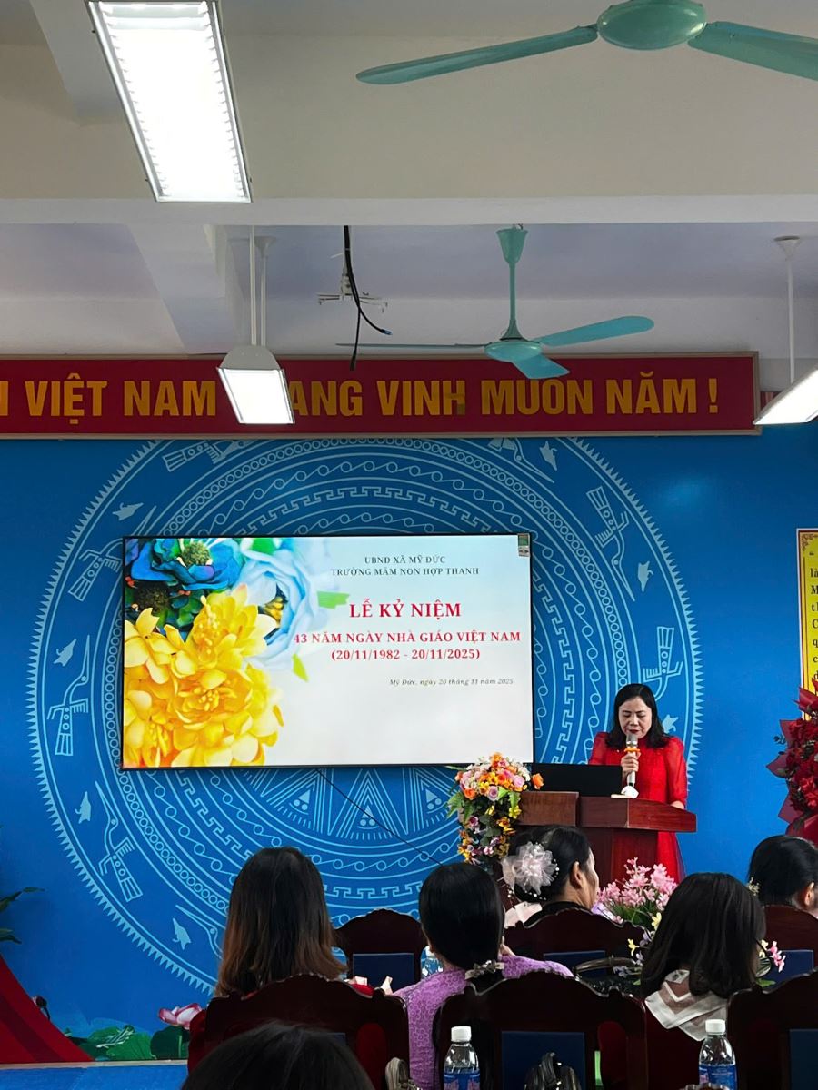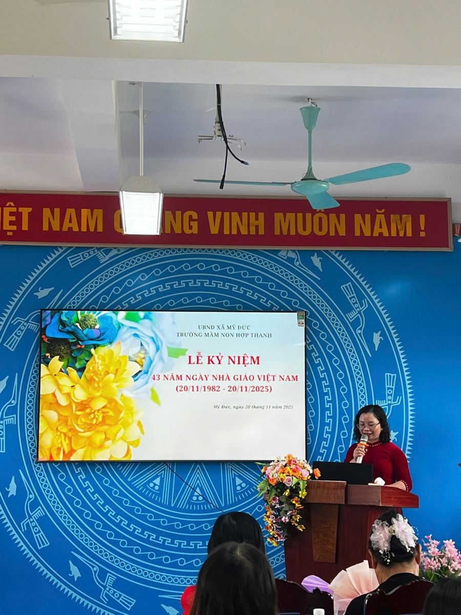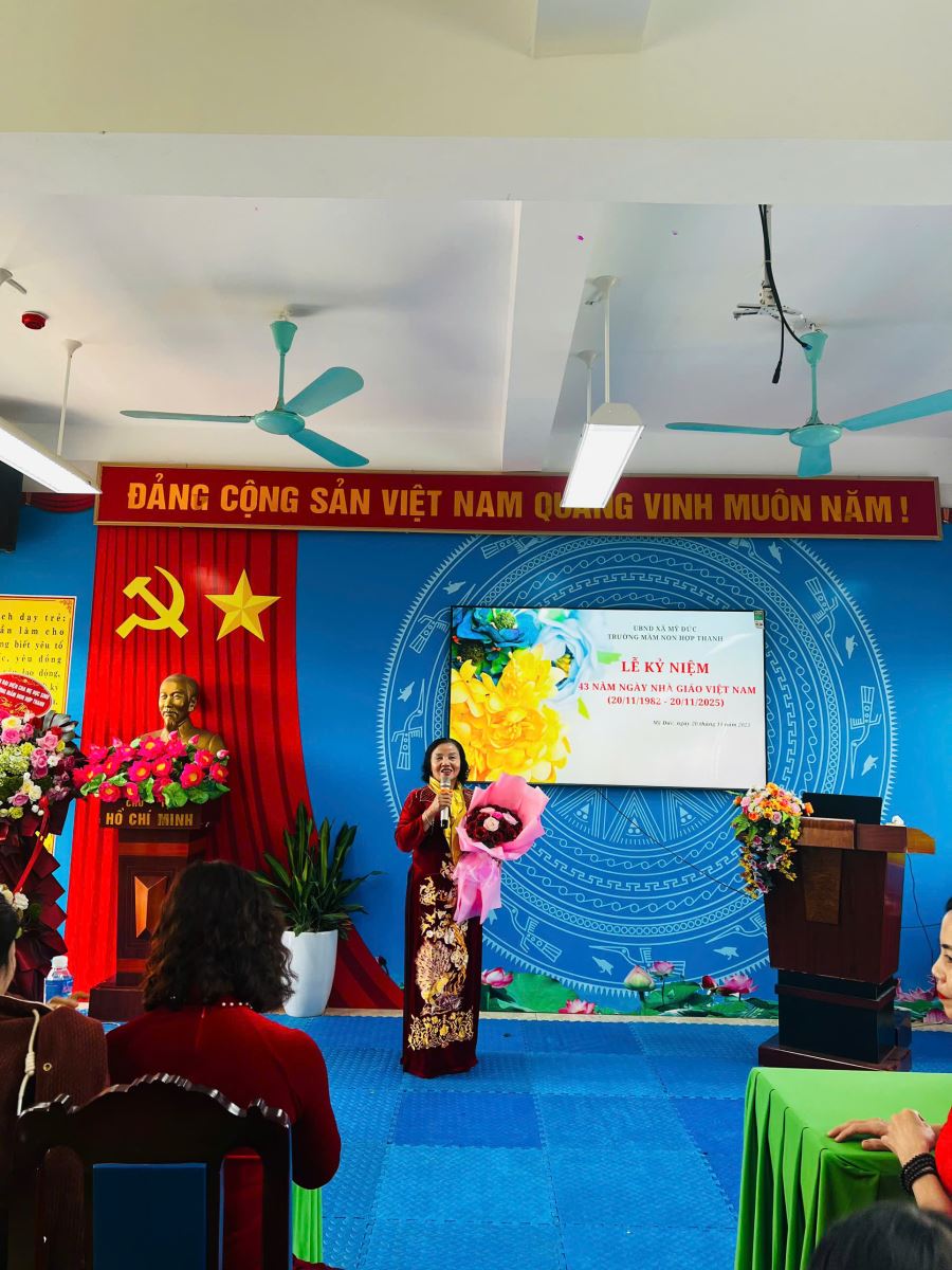21/11/2025 A- A A+ | TRƯỜNG MẦM NON HỢP THANH LONG TRỌNG TỔ CHỨC LỄ KỶ NIỆM NGÀY NHÀ GIÁO VIỆT NAM Xem Chia s? TRƯỜNG MẦM NON HỢP THANH LONG TRỌNG TỔ CHỨC LỄ KỶ NIỆM NGÀY NHÀ GIÁO VIỆT NAM 20/11/2025, TRI ÂN CÁC THẾ HỆ NHÀ GIÁO VÀ TUYÊN DƯƠNG CÁ NHÂN XUẤT SẮC Hòa chung không khí cả nước hướng về Ngày Nhà giáo Việt Nam, sáng ngày 20/11/2025, Trường Mầm non Hợp Thanh đã long trọng tổ chức Lễ kỷ niệm Ngày Nhà giáo Việt Nam 20/11 nhằm tri ân những đóng góp to lớn của các thế hệ thầy cô giáo – những người đã và đang miệt mài gieo trồng tri thức. Buổi lễ vinh dự được đón tiếp các cô nguyên Hiệu trưởng, nguyên Hiệu phó và các giáo viên đã nghỉ hưu, những người đã cống hiến công sức, trí tuệ trong việc xây dựng nền móng vững chắc cho nhà trường qua nhiều thời kỳ. Sự hiện diện đầy ấm áp của các cô đã mang đến cho buổi lễ không khí trang trọng nhưng cũng đậm tình nghĩa thầy trò. Đồng hành cùng nhà trường trong ngày lễ còn có Ban đại diện cha mẹ học sinh, những người luôn quan tâm, ủng hộ và phối hợp chặt chẽ với nhà trường trong công tác chăm sóc – nuôi dưỡng – giáo dục trẻ. Mở đầu chương trình là các tiết mục văn nghệ sôi nổi, đầy cảm xúc do cô và trò nhà trường biểu diễn, như những bó hoa tươi thắm gửi đến các thầy cô nhân ngày đặc biệt. Tiếp đó, cô Hiệu trưởng đã ôn lại truyền thống tốt đẹp của nghề giáo và quá trình phát triển của Trường Mầm non Hợp Thanh; đồng thời gửi lời tri ân sâu sắc tới các thế hệ cán bộ – giáo viên – nhân viên đã đóng góp vào sự trưởng thành của nhà trường. Các cô nguyên cán bộ quản lý và giáo viên đã nghỉ hưu cũng chia sẻ nhiều câu chuyện đầy xúc động về những năm tháng gắn bó dưới mái trường Hợp Thanh, gửi gắm niềm tin và kỳ vọng vào đội ngũ giáo viên trẻ – những người đang tiếp tục kế thừa và phát huy truyền thống quý báu. Trong khuôn khổ buổi lễ, nhà trường đã tổ chức khen thưởng những cá nhân có thành tích xuất sắc trong năm học 2024–2025. Đây là sự ghi nhận đầy ý nghĩa cho những nỗ lực đổi mới, tinh thần trách nhiệm và lòng yêu nghề của các thầy cô. Những phần thưởng ấy không chỉ tôn vinh từng cá nhân mà còn góp phần tạo động lực để toàn thể đội ngũ tiếp tục phấn đấu, nâng cao chất lượng giáo dục. Đại diện cha mẹ học sinh cũng gửi lời cảm ơn chân thành đến tập thể sư phạm nhà trường vì những cống hiến thầm lặng trong việc mang đến môi trường học tập an toàn, thân thiện và hạnh phúc cho trẻ. Buổi lễ kết thúc trong không khí trang trọng, ấm áp và đầy cảm xúc, để lại nhiều ấn tượng đẹp trong lòng mỗi người tham dự. Lễ kỷ niệm 20/11 năm nay không chỉ là dịp tri ân mà còn là cột mốc nhắc nhở mỗi thầy cô giáo tiếp tục giữ vững ngọn lửa đam mê, tận tâm với sự nghiệp “trồng người”. Xin kính chúc các thầy cô luôn mạnh khỏe, hạnh phúc và thành công trên hành trình giáo dục đầy ý nghĩa. Tập tin đính kèm Tải về