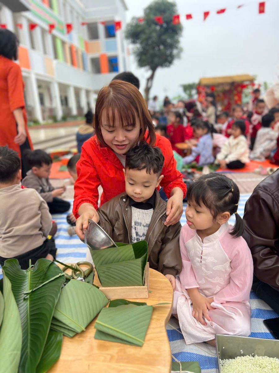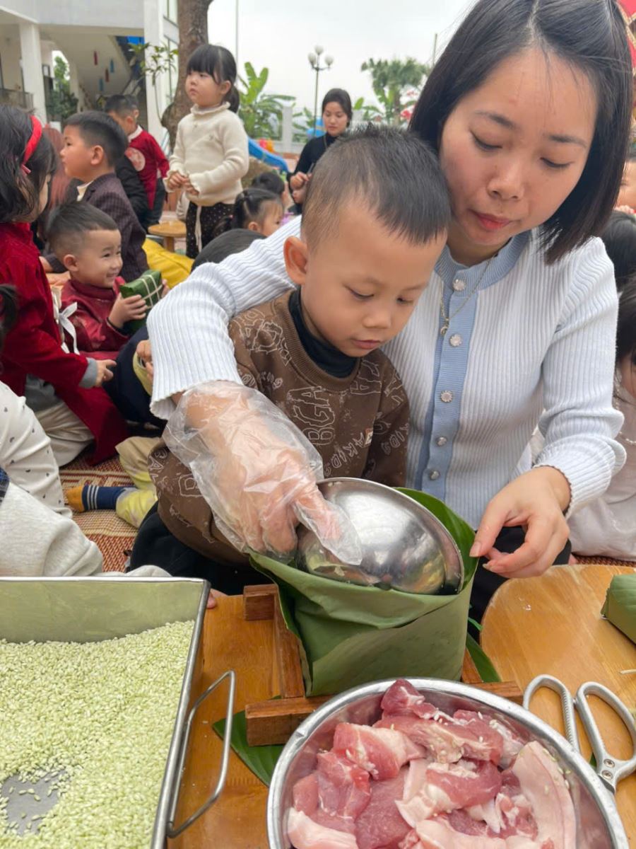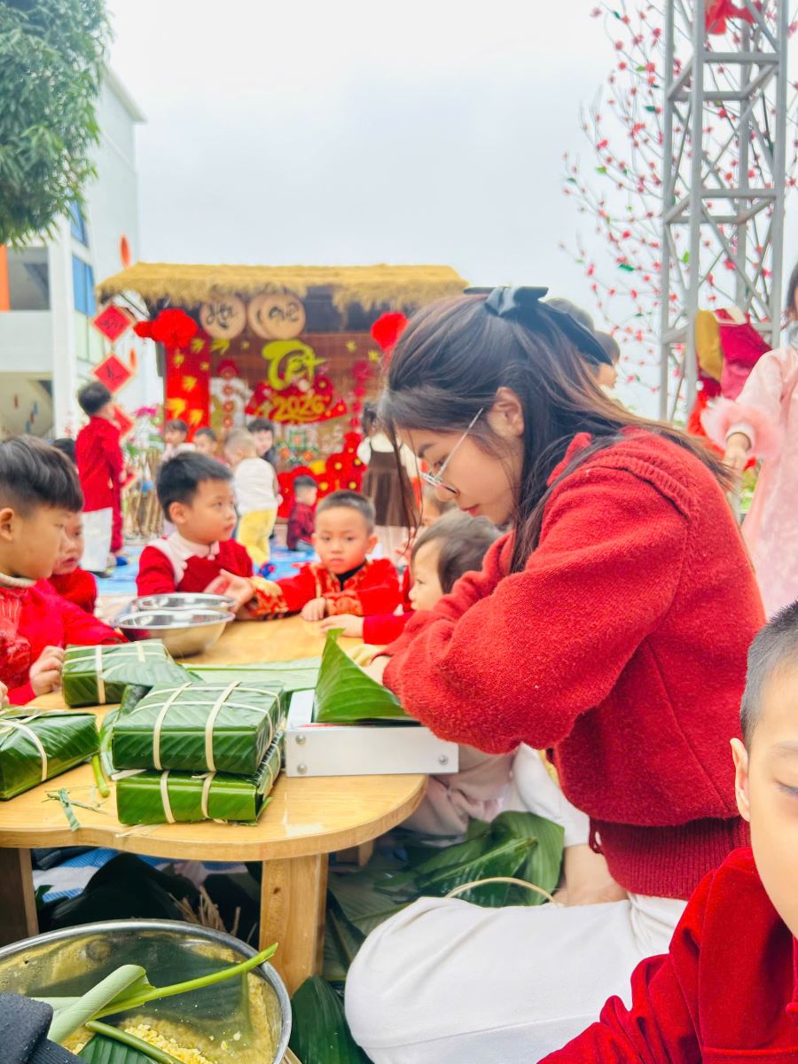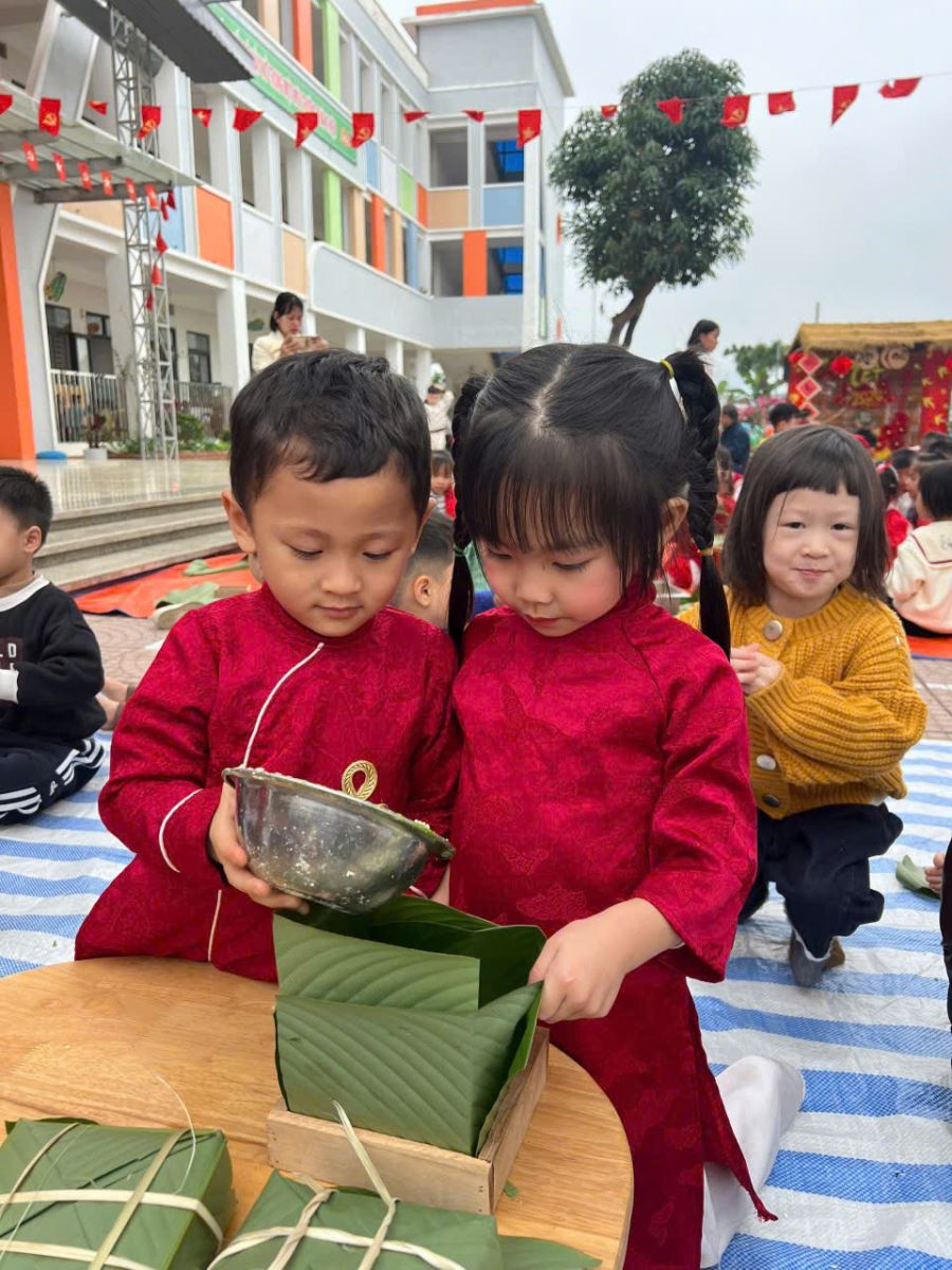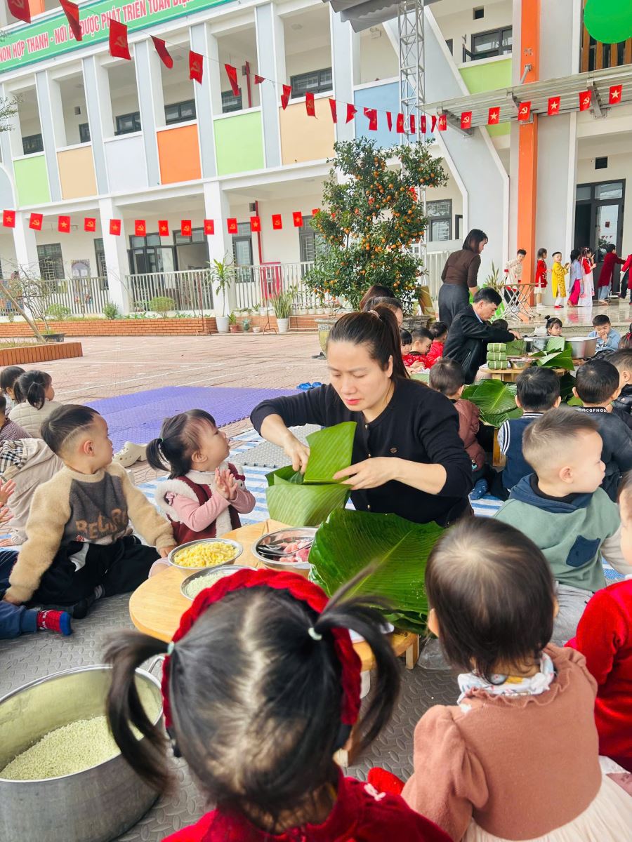 13/02/2026 A- A A+ | TRƯỜNG MẦM NON HỢP THANH TỔ CHỨC HOẠT ĐỘNG GÓI BÁNH CHƯNG CHO TRẺ Xem Chia s? TRƯỜNG MẦM NON HỢP THANH TỔ CHỨC HOẠT ĐỘNG GÓI BÁNH CHƯNG CHO TRẺ (Ngày 11/02/2026) Trong không khí rộn ràng của những ngày đầu xuân, sáng ngày 11/02/2026, Trường Mầm non Hợp Thanh đã tổ chức hoạt động trải nghiệm “Gói bánh chưng ngày Tết” cho các bé. Đây là một hoạt động ý nghĩa nhằm giúp trẻ hiểu thêm về nét đẹp truyền thống của dân tộc Việt Nam mỗi dịp Tết đến, xuân về. Ngay từ sáng sớm, sân trường đã ngập tràn sắc xanh của lá dong, màu trắng của gạo nếp, màu vàng của đỗ xanh và màu hồng tươi của thịt lợn. Dưới sự hướng dẫn tận tình của các cô giáo và sự hỗ trợ của phụ huynh, các bé được quan sát quy trình gói bánh chưng, hiểu được các bước để làm ra chiếc bánh. Các con vô cùng hào hứng khi được tự tay lau lá dong, đong gạo, cho đỗ, xếp thịt và cùng cô gói nên những chiếc bánh vuông vắn. Những bàn tay nhỏ xinh tuy còn vụng về nhưng ánh mắt lại ánh lên niềm vui và sự thích thú. Tiếng cười nói rộn ràng khắp sân trường tạo nên một không khí ấm áp, sum vầy như chính không khí Tết cổ truyền. Hoạt động không chỉ giúp trẻ rèn luyện sự khéo léo, tính kiên trì mà còn giáo dục các con biết trân trọng những giá trị truyền thống, yêu quê hương đất nước và hiểu được ý nghĩa của sự đoàn viên trong gia đình. Đây cũng là dịp để nhà trường tăng cường sự gắn kết giữa gia đình và nhà trường thông qua các hoạt động trải nghiệm thực tế. Buổi trải nghiệm gói bánh chưng khép lại trong niềm vui hân hoan của cô và trò Trường Mầm non Hợp Thanh. Những chiếc bánh chưng xanh không chỉ là thành quả lao động mà còn là minh chứng cho một ngày học tập đầy ý nghĩa, góp phần nuôi dưỡng trong tâm hồn trẻ thơ tình yêu văn hóa dân tộc ngay từ những năm tháng đầu đời. Tập tin đính kèm Tải về