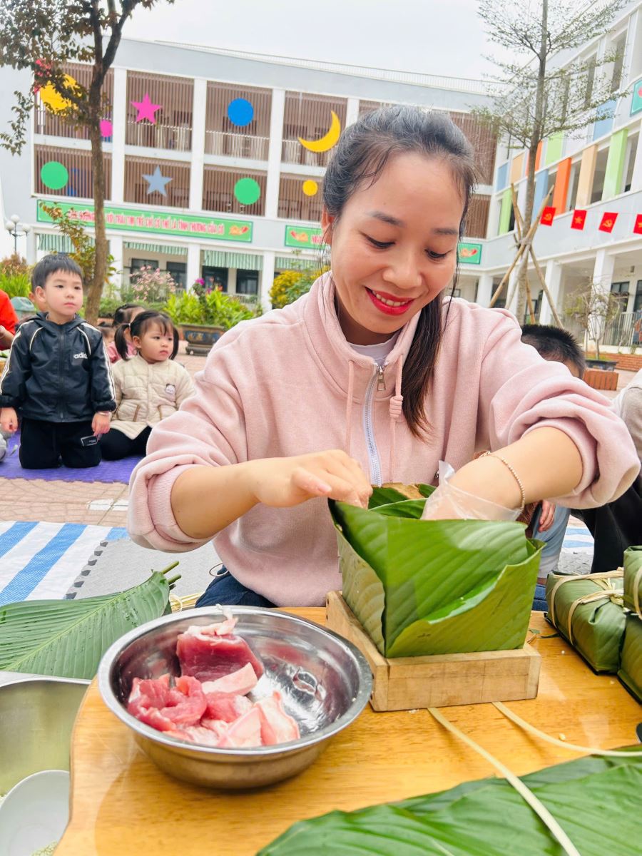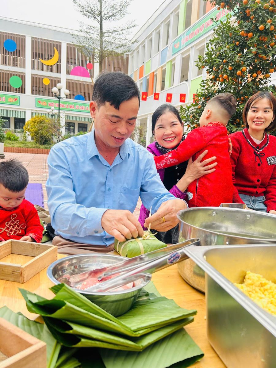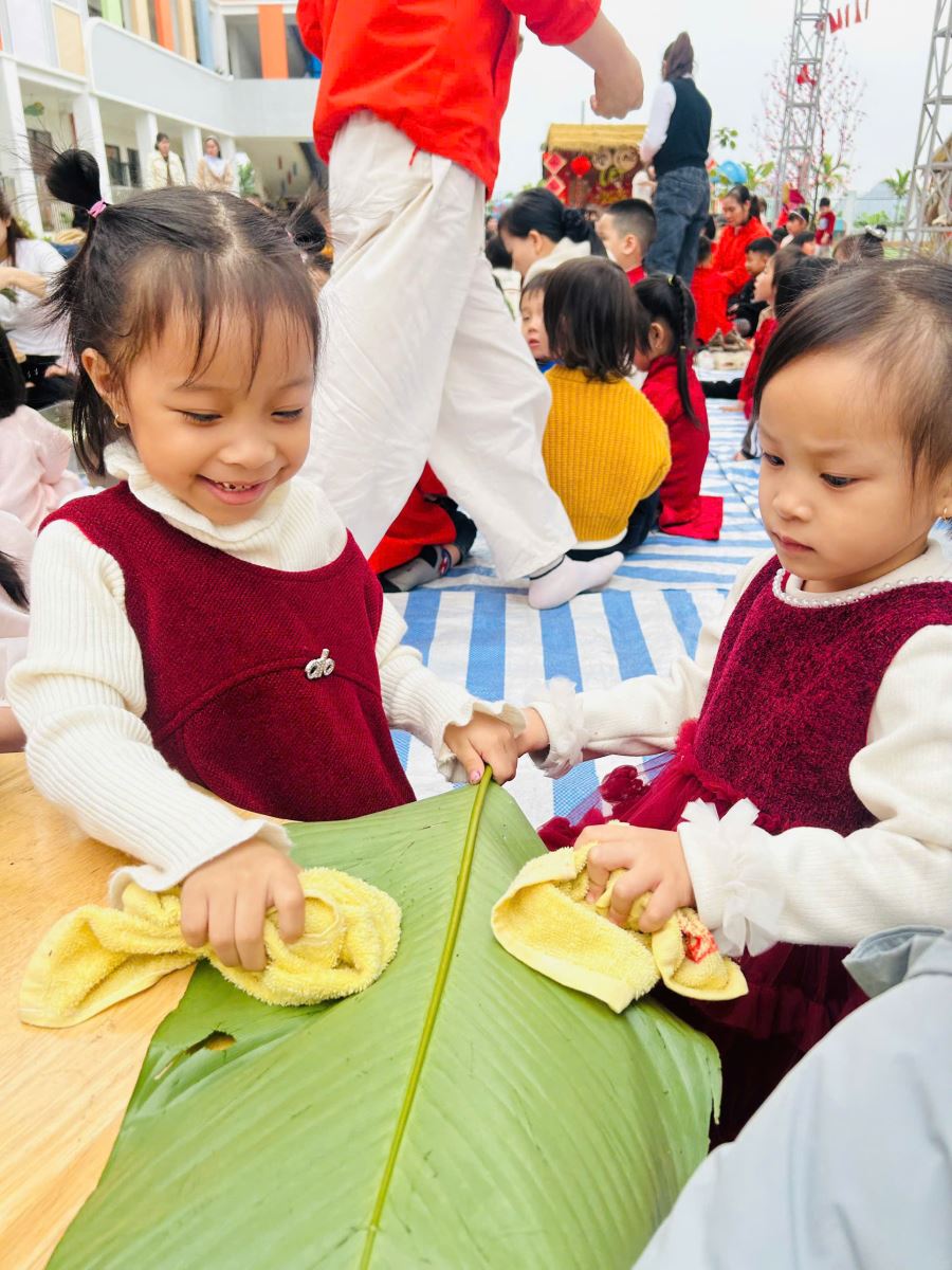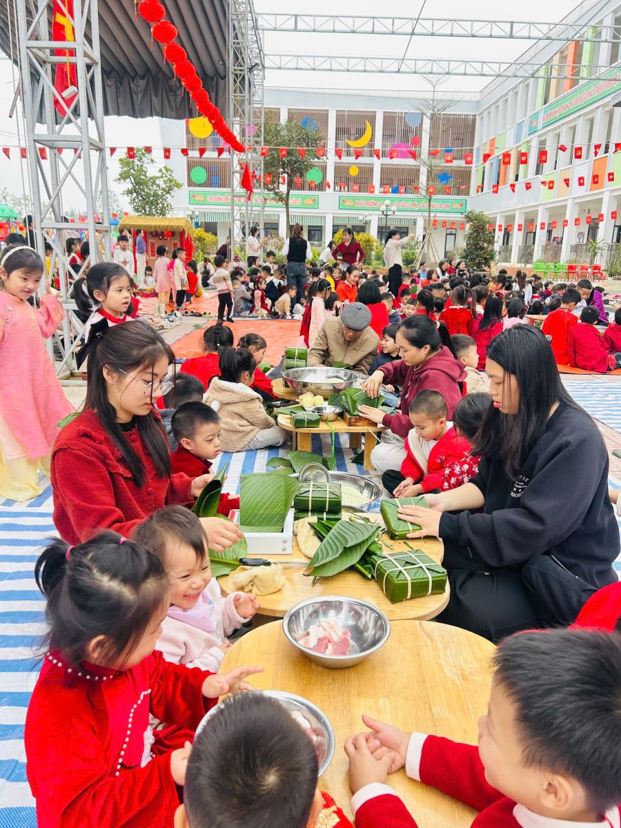 13/02/2026 A- A A+ | TRƯỜNG MẦM NON HỢP THANH TỔ CHỨC HOẠT ĐỘNG GÓI BÁNH CHƯNG CHO TRẺ Xem Chia s? TRƯỜNG MẦM NON HỢP THANH TỔ CHỨC HOẠT ĐỘNG GÓI BÁNH CHƯNG CHO TRẺ (Ngày 11/02/2026) Trong không khí rộn ràng của những ngày đầu xuân, sáng ngày 11/02/2026, Trường Mầm non Hợp Thanh đã tổ chức hoạt động trải nghiệm “Gói bánh chưng ngày Tết” cho các bé. Đây là một hoạt động ý nghĩa nhằm giúp trẻ hiểu thêm về nét đẹp truyền thống của dân tộc Việt Nam mỗi dịp Tết đến, xuân về. Ngay từ sáng sớm, sân trường đã ngập tràn sắc xanh của lá dong, màu trắng của gạo nếp, màu vàng của đỗ xanh và màu hồng tươi của thịt lợn. Dưới sự hướng dẫn tận tình của các cô giáo và sự hỗ trợ của phụ huynh, các bé được quan sát quy trình gói bánh chưng, hiểu được các bước để làm ra chiếc bánh. Các con vô cùng hào hứng khi được tự tay lau lá dong, đong gạo, cho đỗ, xếp thịt và cùng cô gói nên những chiếc bánh vuông vắn. Những bàn tay nhỏ xinh tuy còn vụng về nhưng ánh mắt lại ánh lên niềm vui và sự thích thú. Tiếng cười nói rộn ràng khắp sân trường tạo nên một không khí ấm áp, sum vầy như chính không khí Tết cổ truyền. Hoạt động không chỉ giúp trẻ rèn luyện sự khéo léo, tính kiên trì mà còn giáo dục các con biết trân trọng những giá trị truyền thống, yêu quê hương đất nước và hiểu được ý nghĩa của sự đoàn viên trong gia đình. Đây cũng là dịp để nhà trường tăng cường sự gắn kết giữa gia đình và nhà trường thông qua các hoạt động trải nghiệm thực tế. Buổi trải nghiệm gói bánh chưng khép lại trong niềm vui hân hoan của cô và trò Trường Mầm non Hợp Thanh. Những chiếc bánh chưng xanh không chỉ là thành quả lao động mà còn là minh chứng cho một ngày học tập đầy ý nghĩa, góp phần nuôi dưỡng trong tâm hồn trẻ thơ tình yêu văn hóa dân tộc ngay từ những năm tháng đầu đời. Tập tin đính kèm Tải về